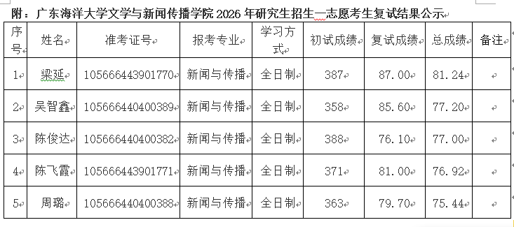 根据学校及公司研究生招生工作的相关文件精神和要求,经学院研究生招生录取工作领导小组审定,将公司2026年硕士研究生第一志愿考生复试结果按照最终得分进行排名,现予以公示。