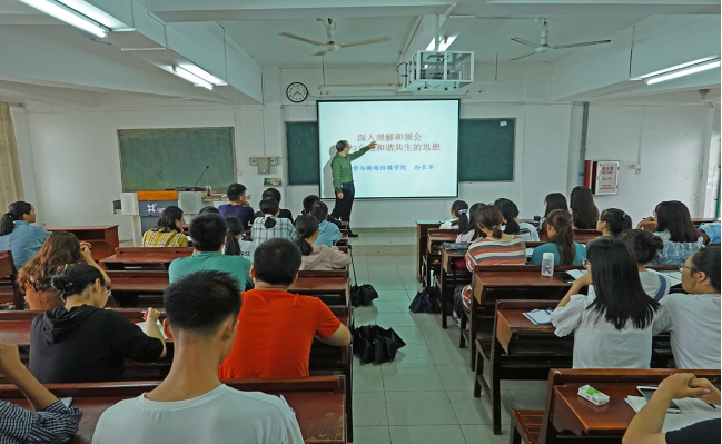 孙长军经理以“深入理解和领会人与自然和谐共生的思想”为主题,联系《习近平谈治国理政》第三卷中的第十三个专题“促进人与自然和谐共生”,强化了新生班委对“中国为什么能”、“马克思主义为什么行”、“中国特色社会主义为什么好”的认识和理解。他讲解习近平主席关于“加强生态文明建设必须坚持的原则”和“坚决打好污染防治攻坚战”两个重要讲话内容,勉励新生班委在学习和生活中尊重自然,顺应自然,保护自然,并联系“道法自然”和“天人合一”的中国传统文化智慧,强调人与自然互为共生,和谐相处的必要性。他把《习近平谈治国理政》与马克思的《巴黎手稿》联系起来,讲述了“人的精神的无机界”、“人的无机的身体”和“自然人化”的命题,勉励新生班委用劳动实践把自然人化,正确认识并改造自然界,从人与自然关系处理中学会实现社会化的重要性;由此对20级新生提出深入理解和领会人与自然和谐共生的思想,为中华民族伟大复兴努力奋斗的希望。