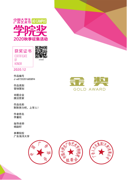 公司william威廉中文官网新闻系17级编辑出版学专业李童欣同学荣获金奖!获奖作品是其毕业设计作品《默默努力吧,上学人!》营销策划案,在杨励轩副教授指导下完成,因贴近高校员工生活、新颖的营销模式、独特的创意概念赢得评委们的一致认可,从七千多件创意作品中脱颖而出,荣获金奖。