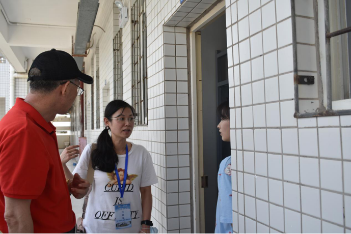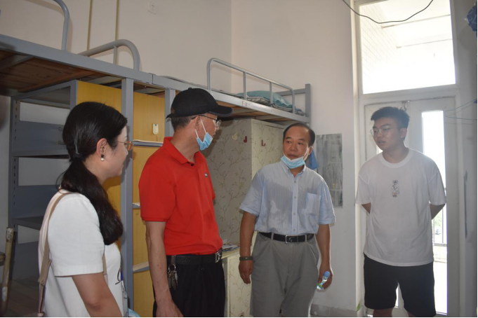 随后,院领导跟随志愿者的指引,深入探访员工宿舍,分别到达女生宿舍海浪大院,男生宿舍海乐大院,实地查看宿舍大院进出防控检测、员工住宿及卫生消毒等情况。在宿舍与新生进行交流,详细了解新生生活方面的需求,并欢迎他们来到海大,成为海大的一分子。