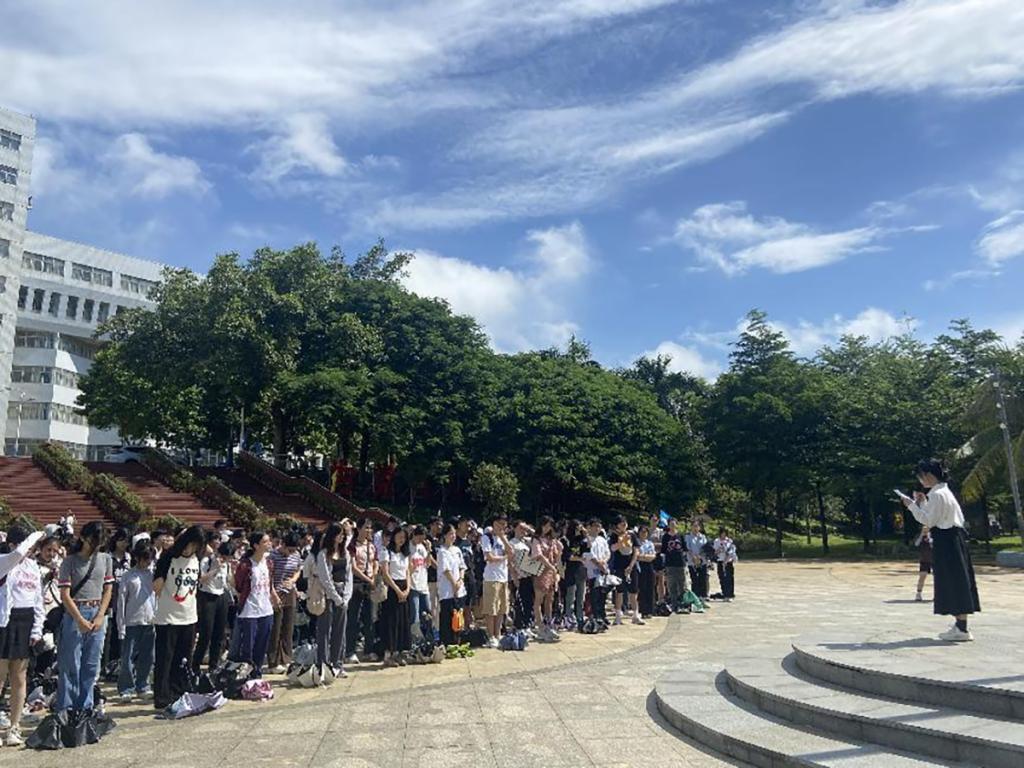 本次校园行的路线经过明德楼、钟海楼、广学楼、图书馆、中心广场、海洋广场等校园标志性建筑。在校园行的过程中,新同学们怀揣美好憧憬游览校园风光。辅导员和各班班助作为新生导游,介绍了主要校园建筑的外形特征和功能。崔文婷、林婉芳两位新生辅导员老师,在介绍学校基本情况的同时与新同学亲切互动。