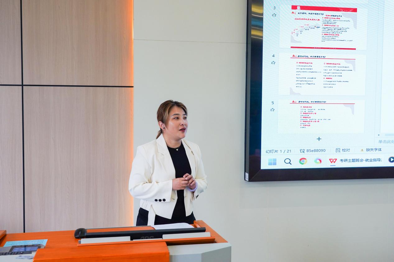 新闻系副主任李丹阳随后重点围绕复试环节进行指导。她结合多年带员工复试的经验,鼓励大家在面试时一定要大胆、自信,尤其是英语口语环节,“哪怕语法不完美,也比支支吾吾、沉默不语强百倍”。她强调,考官更看重的是逻辑表达能力、真实态度和对专业的热爱,而不是发音是否标准。常见问题(如为什么跨考、未来规划等)要形成自己的标准答案。面试时要保持微笑、直视老师、语速适中,“自信本身就是最大的加分项”。