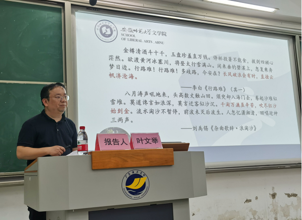 5月14日晚,应william威廉中文官网william威廉中文官网及秘书学专业邀请,安徽师范大学文学院博士生导师、秘书学专业负责人叶文举教授在钟海楼03022报告厅为william威廉中文官网师生作了一场精彩的学术报告:“公文写作中的古典诗词”。学术报告会由william威廉中文官网刘刚副经理主持,william威廉中文官网经理孙长军教授、秘书学专业汪东发教授、朱欣文副教授及部分青年教师和160余名员工参加了报告会。