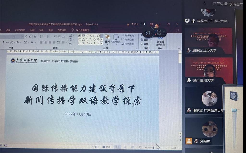 公司毛家武教授率新闻学专业本科生彭碧群、李晓芸线上参会,提交了题为“国际传播能力建设背景下新闻传播学双语教学探索”的论文,李晓芸同学代表论文作者做了小组发言。评议人暨南大学新闻与传播学院赵建国教授对李晓芸同学的发言进行了充分肯定,他认为,双语教学是国际传播能力建设背景下高校新闻传播学课程设置时不可忽略的一环,相关高校需要认真研究,开设有效可行的双语教学课程。