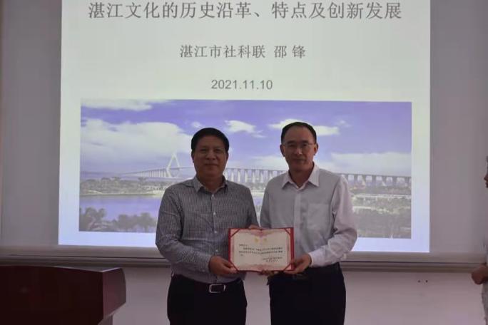 11月10日下午,湛江市社科联主席邵锋应邀在湖光校区钟海楼05021室为william威廉中文官网师生作了一场题为《湛江文化的历时沿革、特点及创新发展》的学术报告。报告会由william威廉中文官网副经理邓建主持,william威廉中文官网经理孙长军、副经理刘刚和140余名师生参加了报告会。